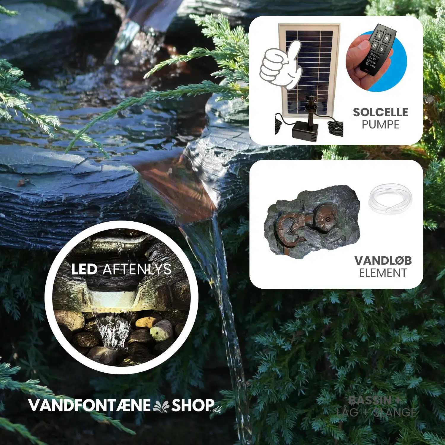 Vandløb med solcellepumpe, LED lys (Greifenstein design) Har du allerede en havedam, bassin eller balje i dine have eller bed? Så kan du med denne pakke nemt og enkelt tilføje et smukt designet og formstøbt vandløb element ved din dam/bassin, der drive