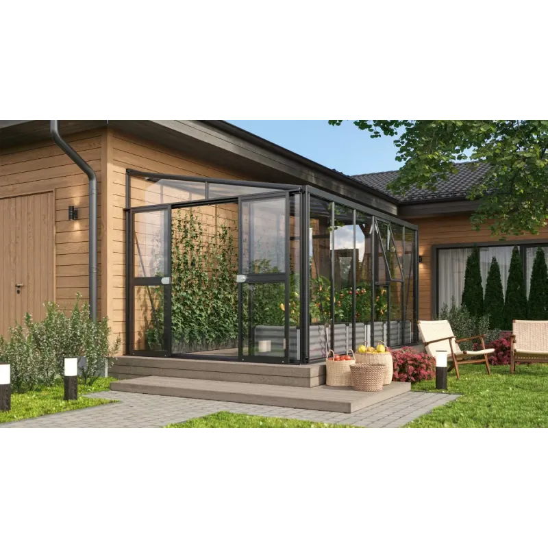Vitavia Helena 2 10200 Sort Drivhus 3mm Hærdet Glas /10mm Polytag Et drivhus fra Helena-serien er skabt til dig der er på udkig efter et særdeles flot og elegant vægdrivhus. Helena leveres med intet mindre end 10 mm polycarbonatplader i taget. Resten af