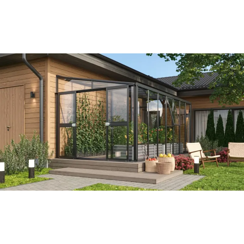 Vitavia Helena 2 11900 Sort Drivhus 3mm Hærdet Glas /10mm Polytag Et drivhus fra Helena-serien er skabt til dig der er på udkig efter et særdeles flot og elegant vægdrivhus. Helena leveres med intet mindre end 10 mm polycarbonatplader i taget. Resten af