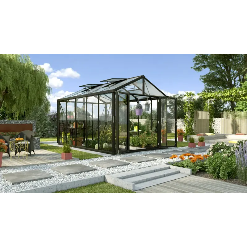 Vitavia Poseidon 10000 Sort Drivhus 3mm Hærdet Glas /10mm Polytag Et drivhus fra Poseidon-serien er et stærkt, flot drivhus. Her er pladsen god, og der er fuld ståhøjde overalt i drivhuset. Poseidon fåes fra 8,1 m2 til 15,7 m2. Alle størrelser leveres m