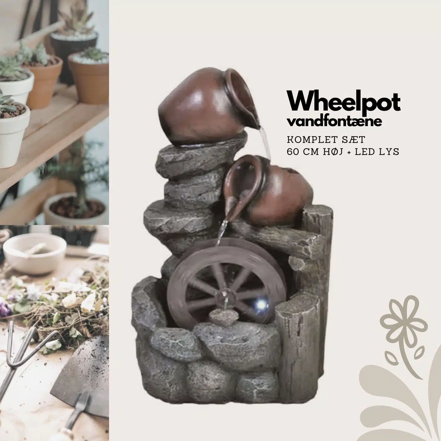 BEMÆRK: Denne vare har været brugt i udstilling, og er derfor let brugt. Derfor er prisen også meget lav. Garanti 1 år. Læs mere om varen nedenfor Fint springvand til haven eller terrasse-området lavet af polyresin med krukker og møllehjul. Størrelse: