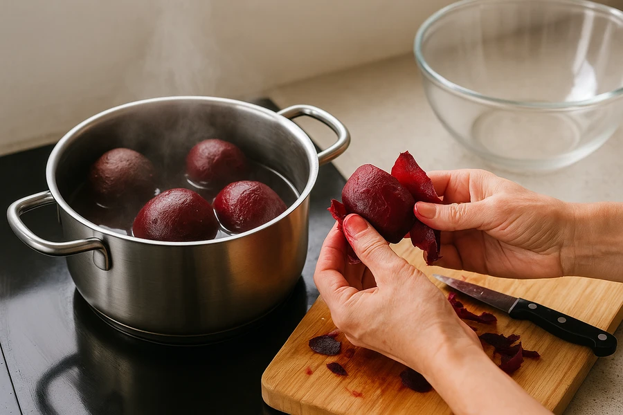 - Kog rødbederne: skyl og kog hele rødbeder i letsaltet vand i 30–40 minutter, afhængigt af størrelse.