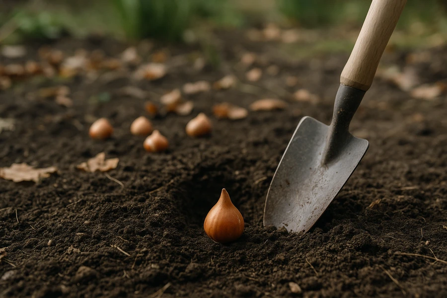 • Plant i dybde svarende til 3 × løgets højde (typisk 10–15 cm).